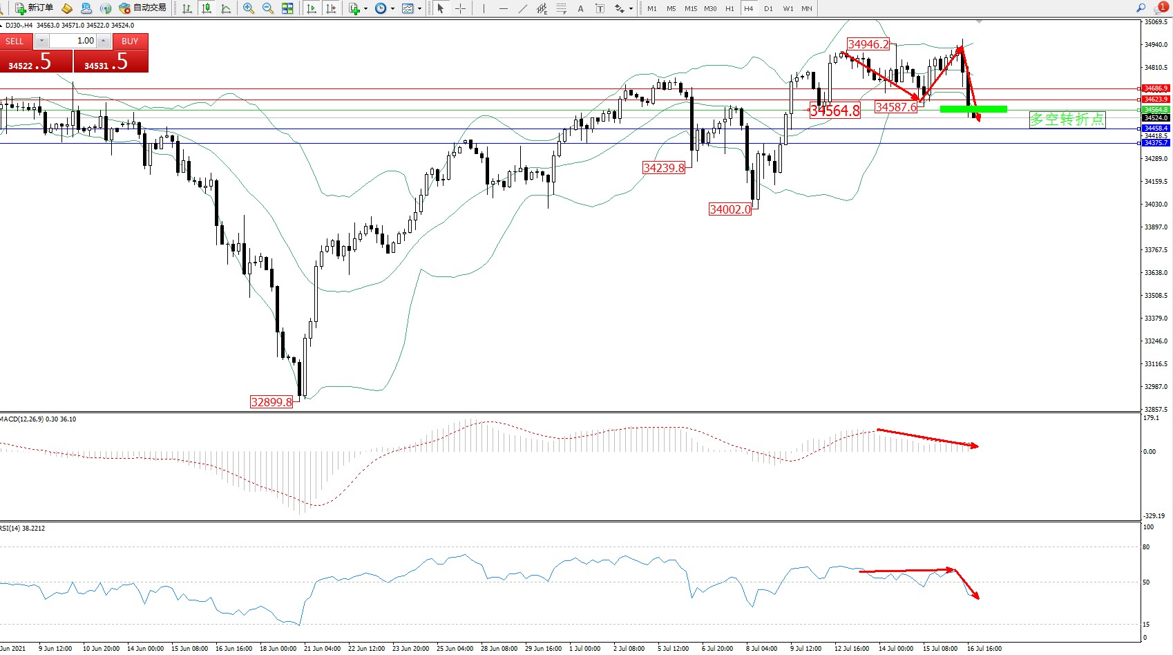 交易策略:34564下方看跌,目标34458、34375