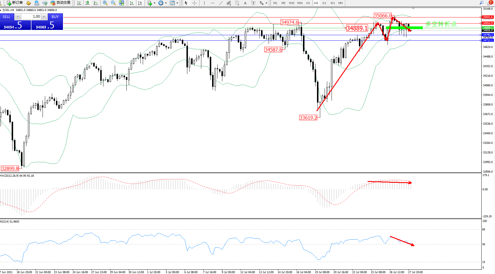 交易策略:34889下方看跌,目标34790、34712