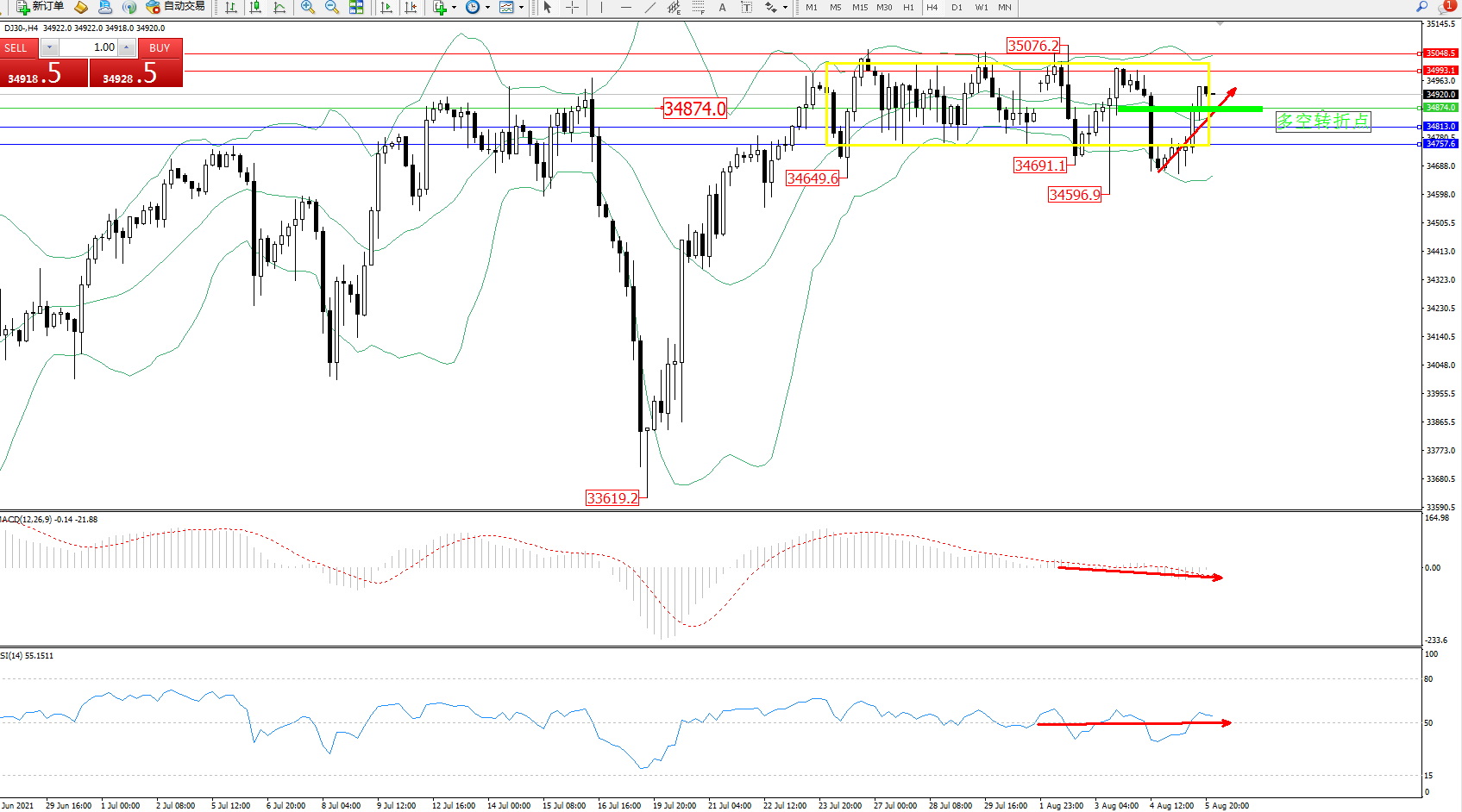道琼斯指数DJ30——4小时K线图显示: