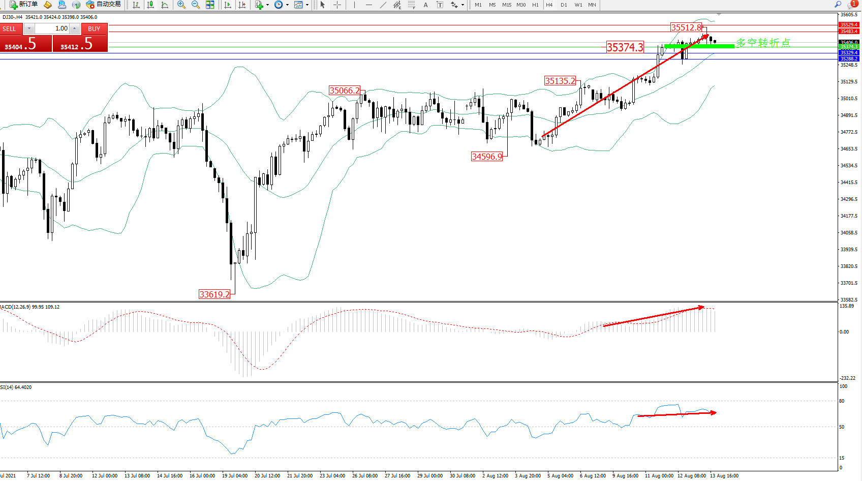 道琼斯指数DJ30——4小时K线图显示: