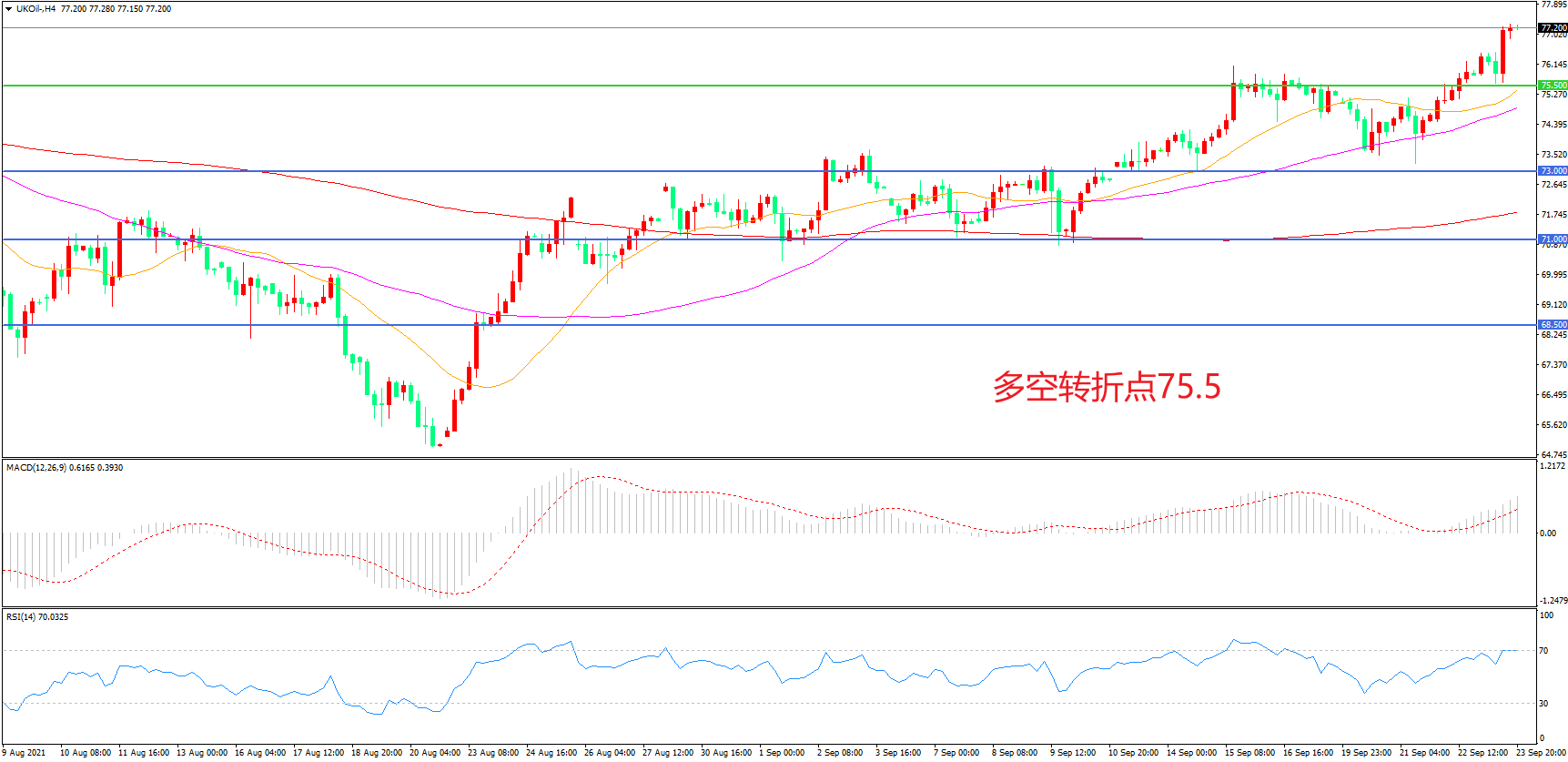 4小时图看,油价长阳拉升,短期走势偏强,均线系统粘合形成下方支撑,MACD红柱增加,RSI指标走平,日内震荡上行概率较大。