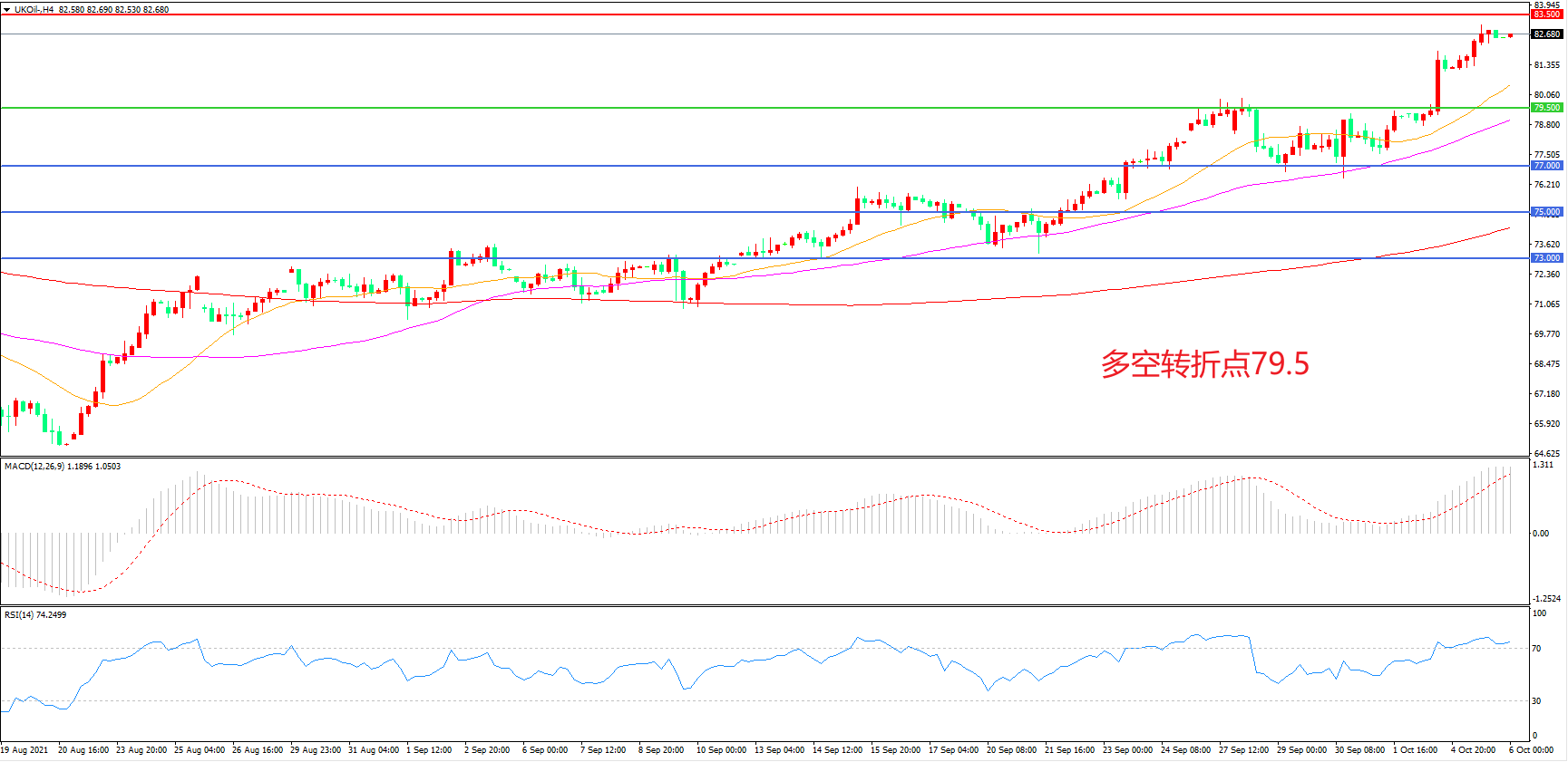 4小时图看,油价突破前期阻力后连续拉升,短期表现较强,均线系统呈多头排列,MACD红柱增加,RSI指标走平,日内延续上行概率较大。