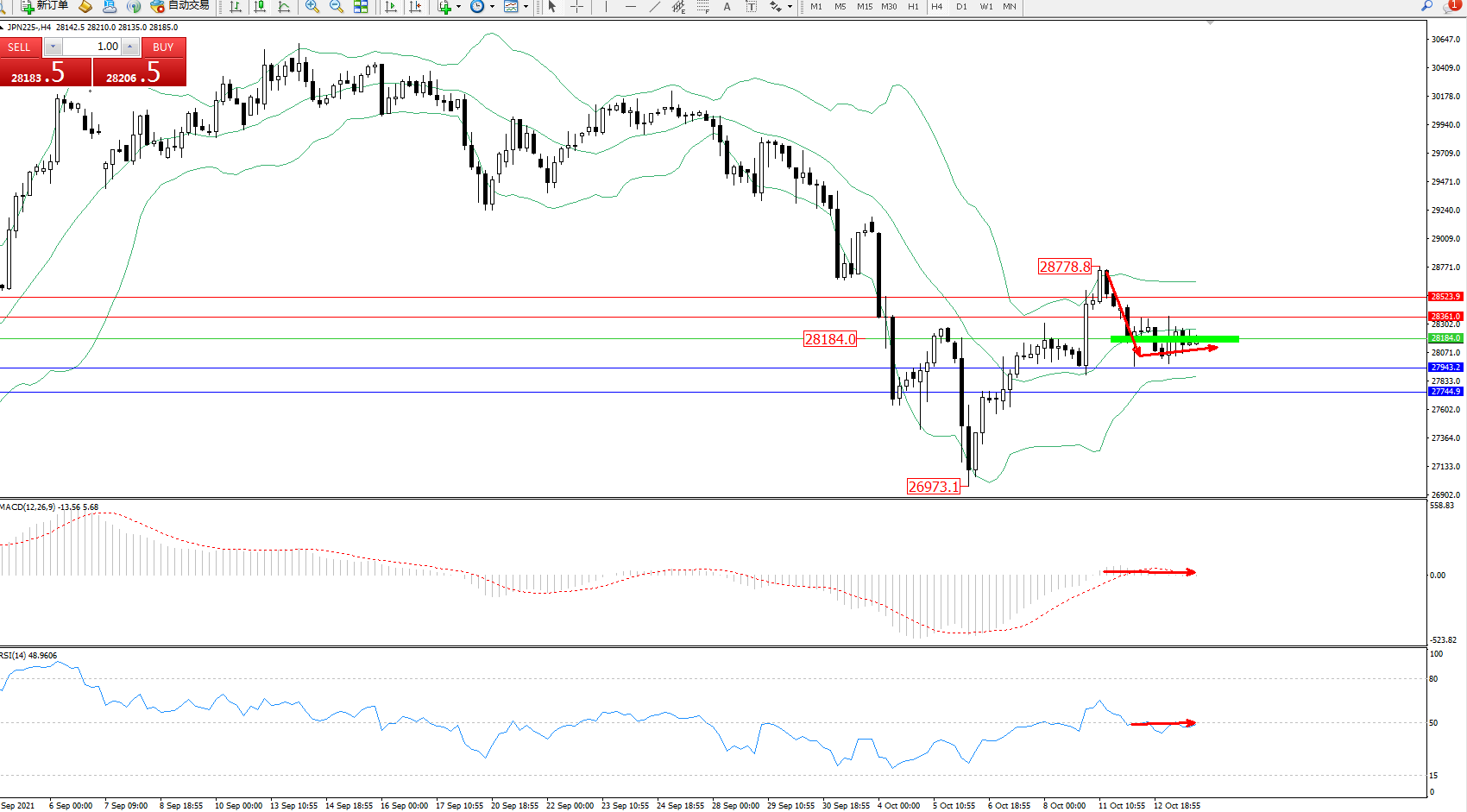技术点评:多头动力维持震荡上移至28778位置后遇阻震荡会呈,高位空头动力维持震荡下行至布林带指标中下轨区间持续整理平移中,布林带指标呈收口走势持续平移,MACD指标处于0轴线附近弱势徘徊,RSI指标处于50均衡线附近持续整理;