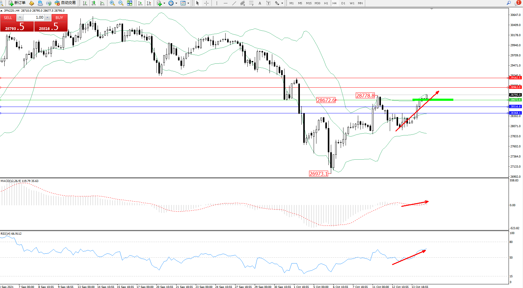 日经指数JPN225——4小时K线图显示: