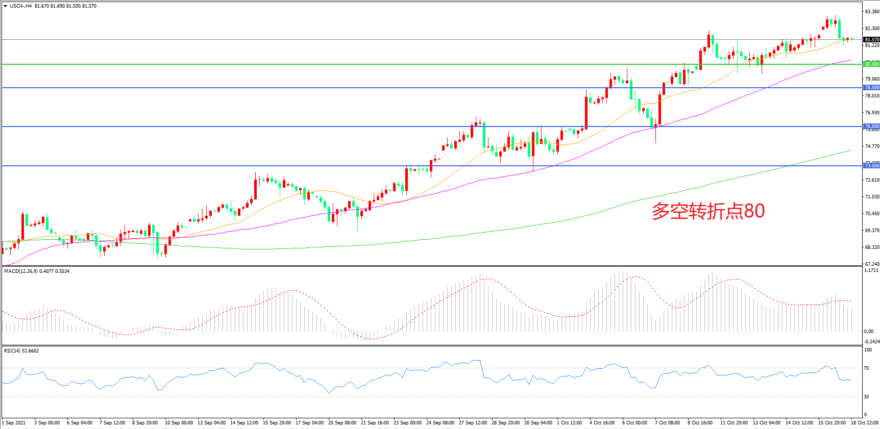 周一(10月18日),OPEC+代表消息称,9月OPEC+未能达到原油生产目标,产量较目标低15%,市场火热情绪再次被推高,美国WTI原油震荡上行,收报81.58美元/桶。目前全球石油库存已降至七年来的最低季节性水平,供需持续向好强势格局下,油价延续上行概率加大。