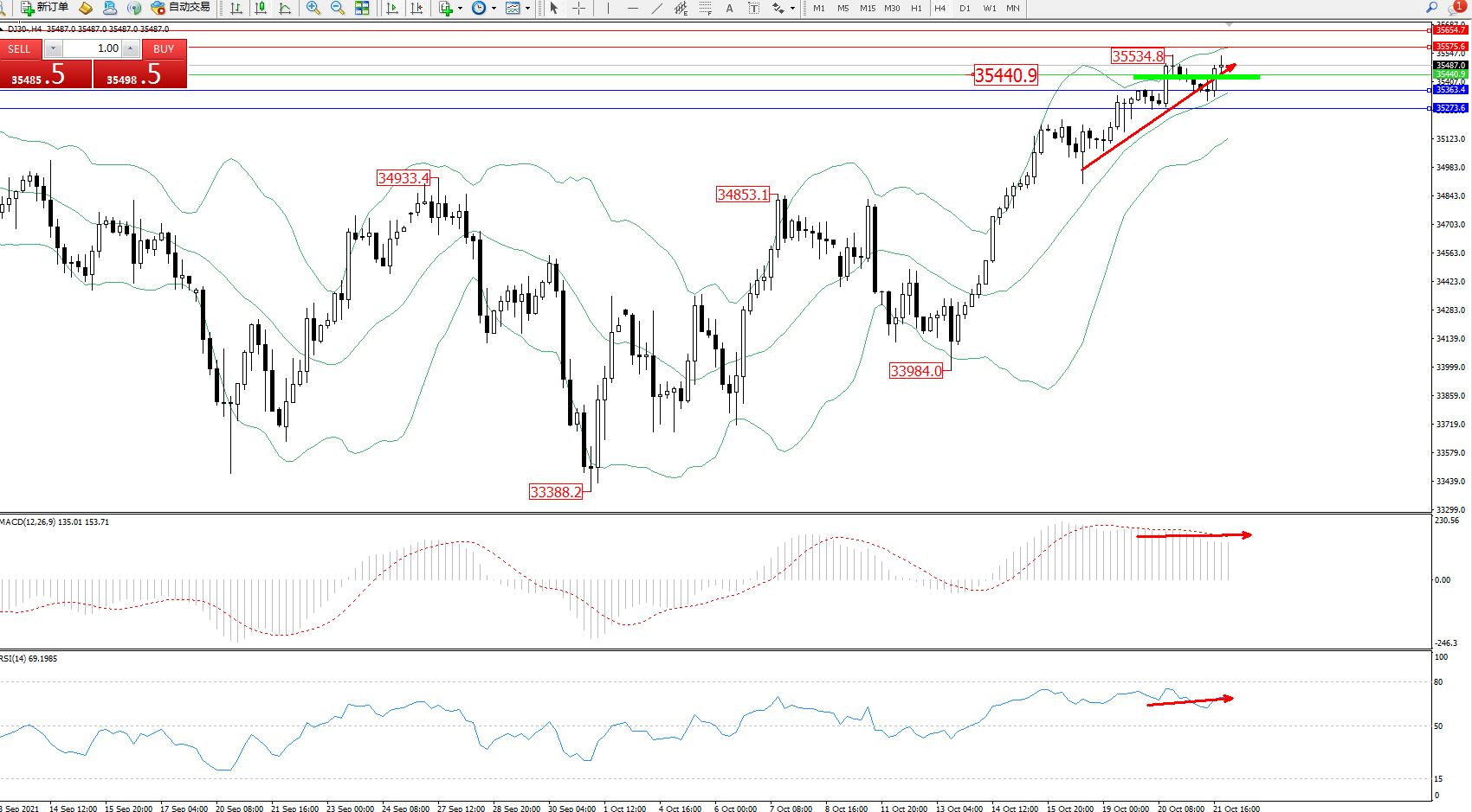技术点评:多头动力延续布林带指标通道中上轨区间持续震荡上扬,高位抵达35534位置后开始短暂整理,多头动力维持高位弱势徘徊,布林带指标多头动力维持整理持续上扬后开始徘徊,MACD指标处于多头区域维持整理平缓下行,RSI指标处于多头区域维持窄幅整理;