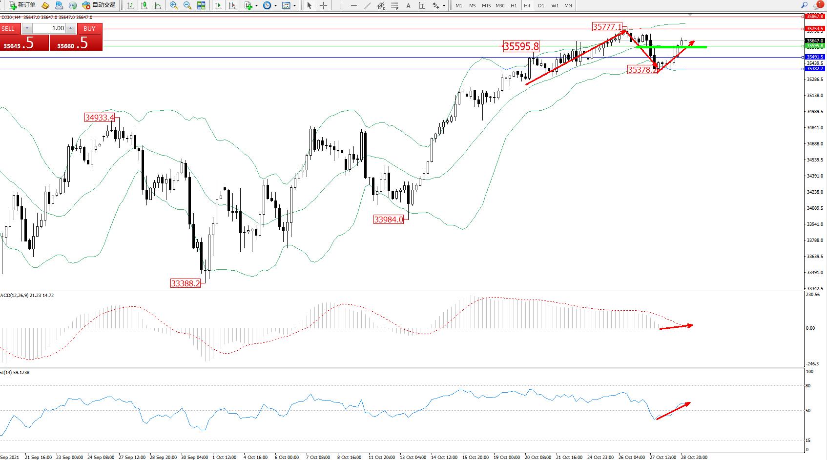 道琼斯指数DJ30——4小时K线图显示: