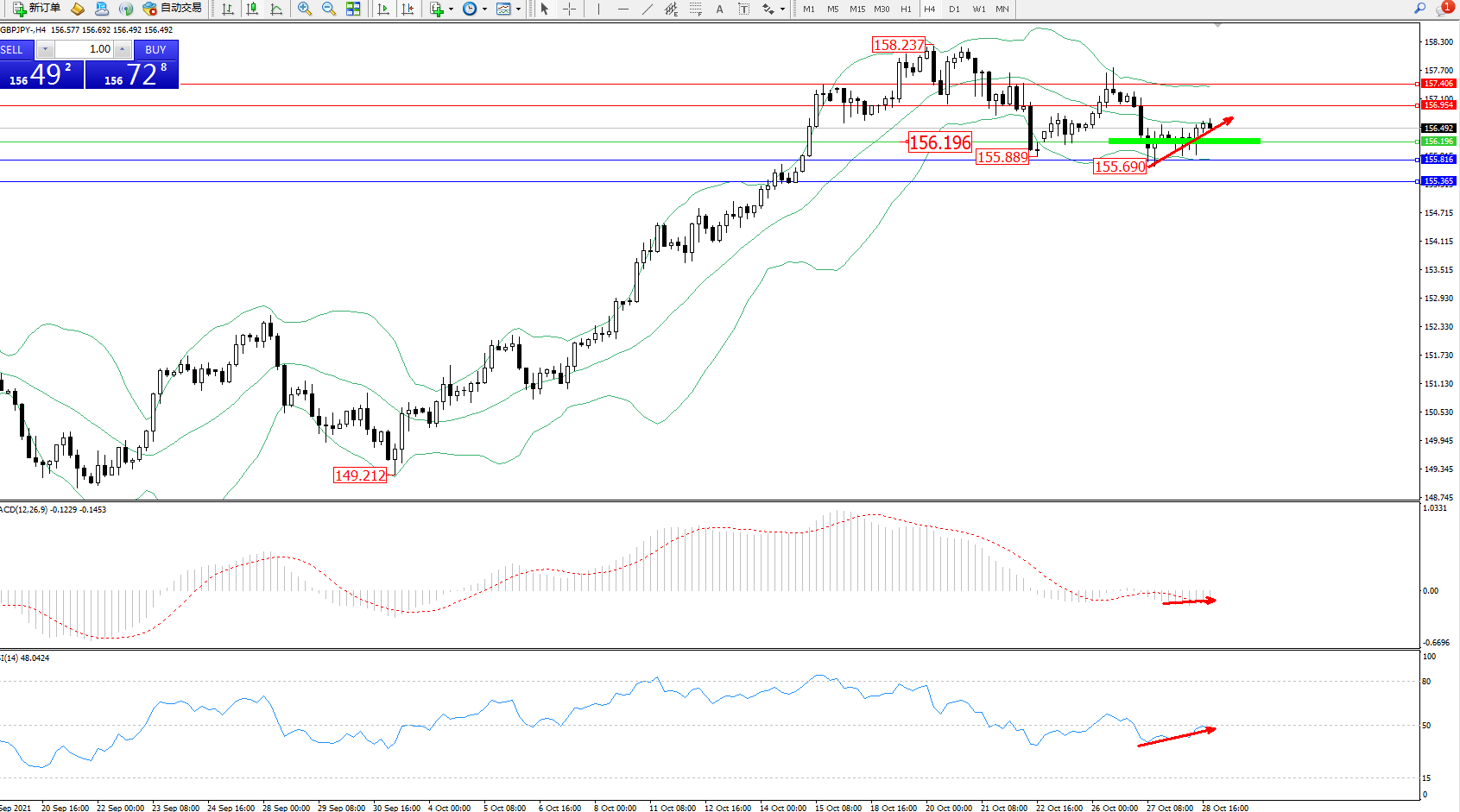 技术点评:空头动力延续布林带指标通道中下轨区间持续震荡下行,低位抵达155.690位置后得到支撑短暂整理缓慢上移,多头动力有伺机入场迹象,布林带指标呈收口走势持续平移中,MACD指标处于0轴线下方空头区域维持整理平移,RSI指标处于50均衡线下方空头区域维持窄幅整理缓慢上移;