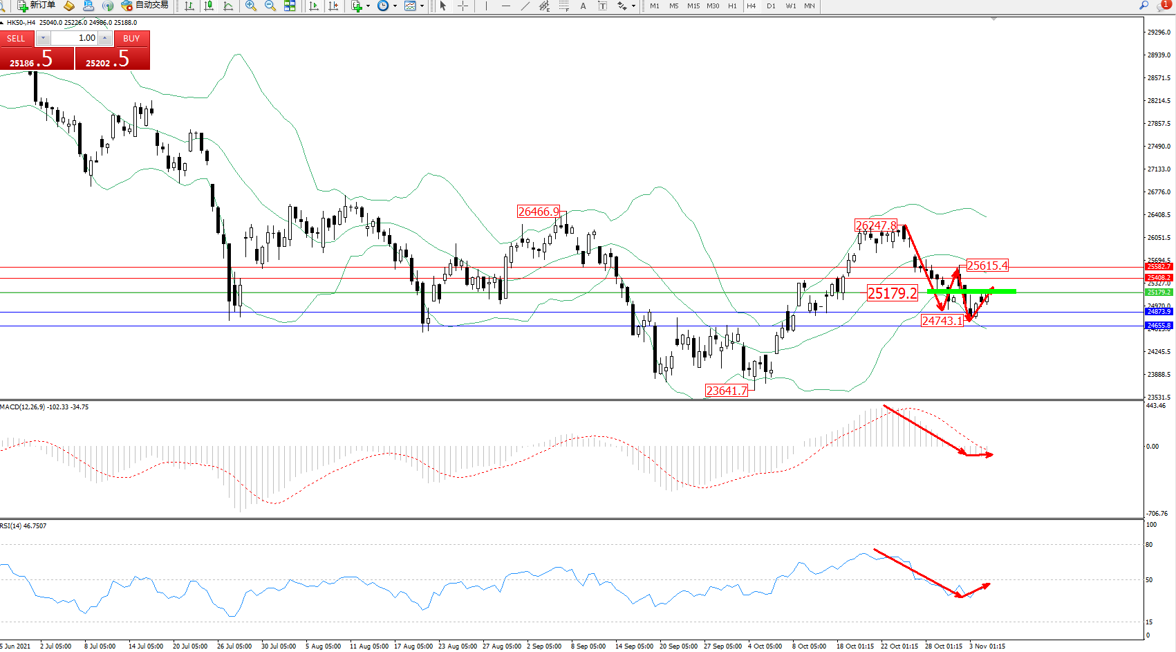 技术点评:空头动力维持布林带指标通道中下轨区间持续震荡下行,低位抵达24743位置得到短暂支撑短暂整理缓慢上移,但空头下行趋势走势依旧,未见强势反攻迹象,布林带指标呈张口走势后开始有缓慢收口迹象,MACD指标处于空头区域维持整理平移,RSI指标空头动力持续下行后开始整理,有上移迹象;