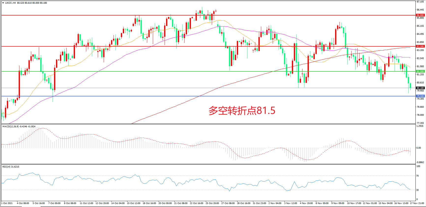 4小时图看,油价弱势震荡后破位大跌,短期走势十分低迷, 81.5美元成为多空分水岭,MACD绿柱增加,RSI指标向下,日内震荡下行概率较大。