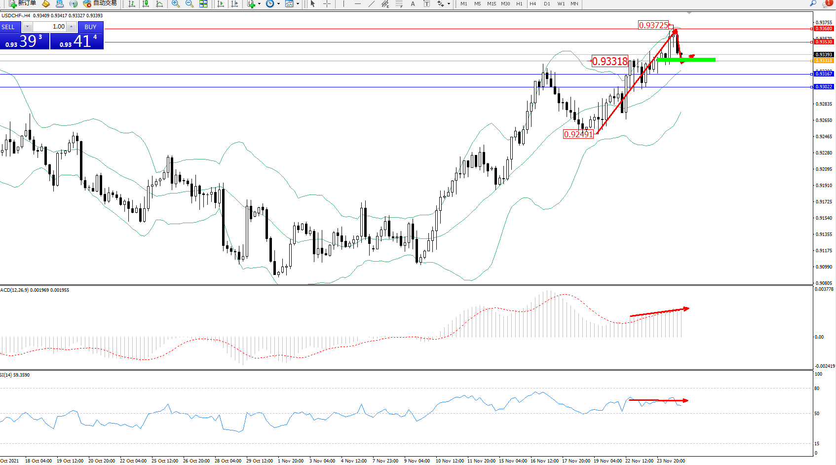 交易策略:0.93318上方看涨,目标0.93530、0.93680