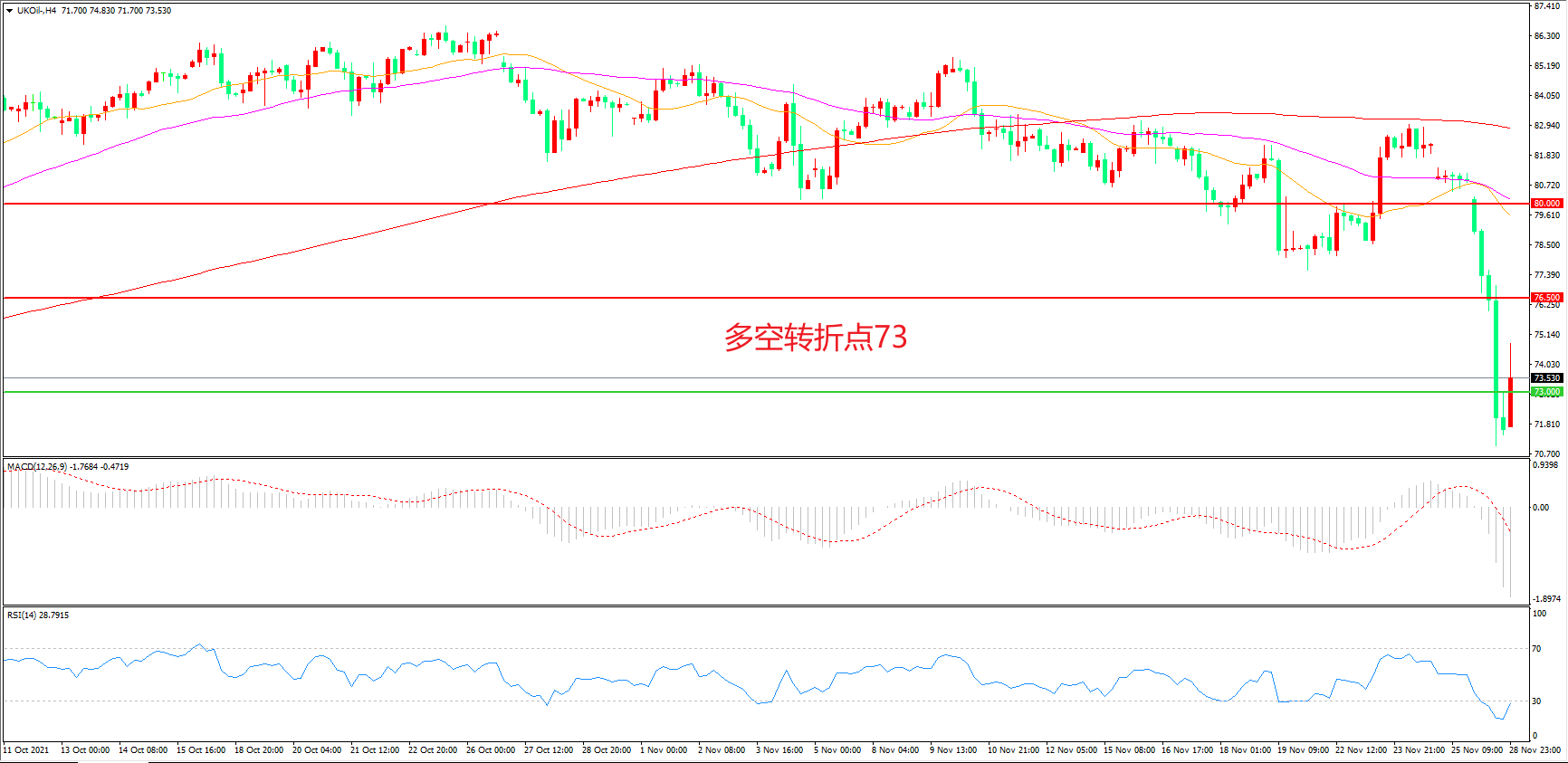 4小时图看,油价大幅跳水后跳空高开,短期走势有所回暖,但均线系统依然呈空头排列,MACD绿柱增加,RSI指标走平,日内震荡下行概率较大。