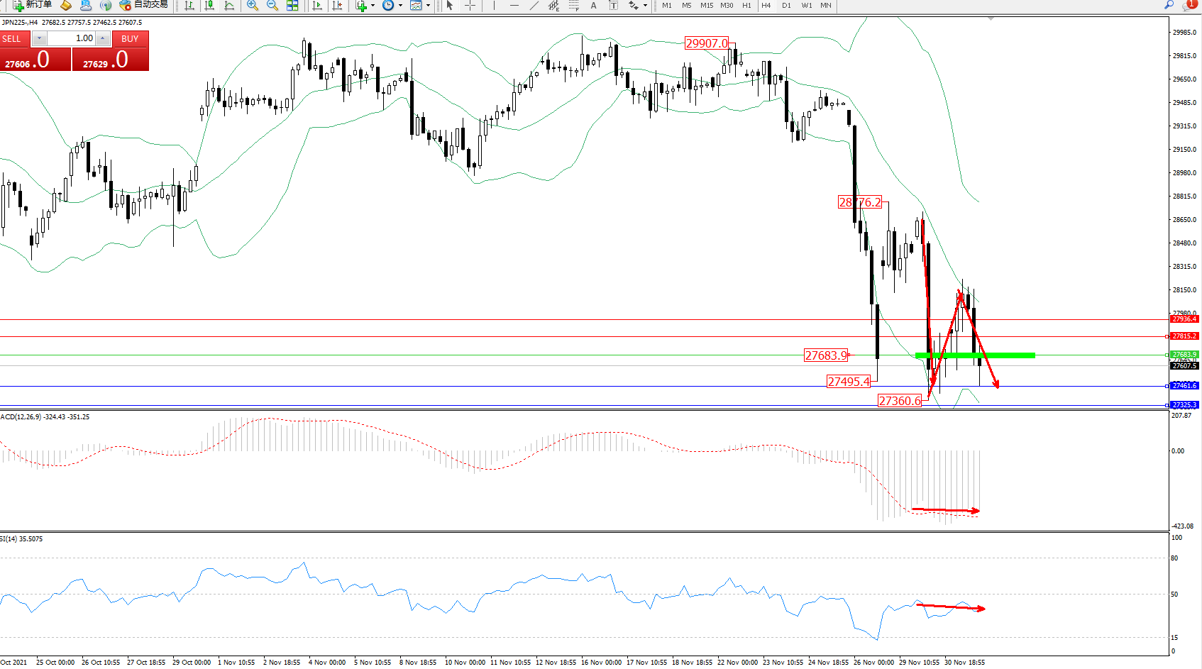 技术点评:长时间维持在布林带指标通道中下轨区间持续宽幅巨震向下移动中,短期跌势未见最终止步迹象,之前低位27360位置近在咫尺破位在即,布林带指标呈收口走势持续向下移动中,MACD指标处于空头区域低位维持震荡平移,RSI指标处于空头区域持续震荡中;
