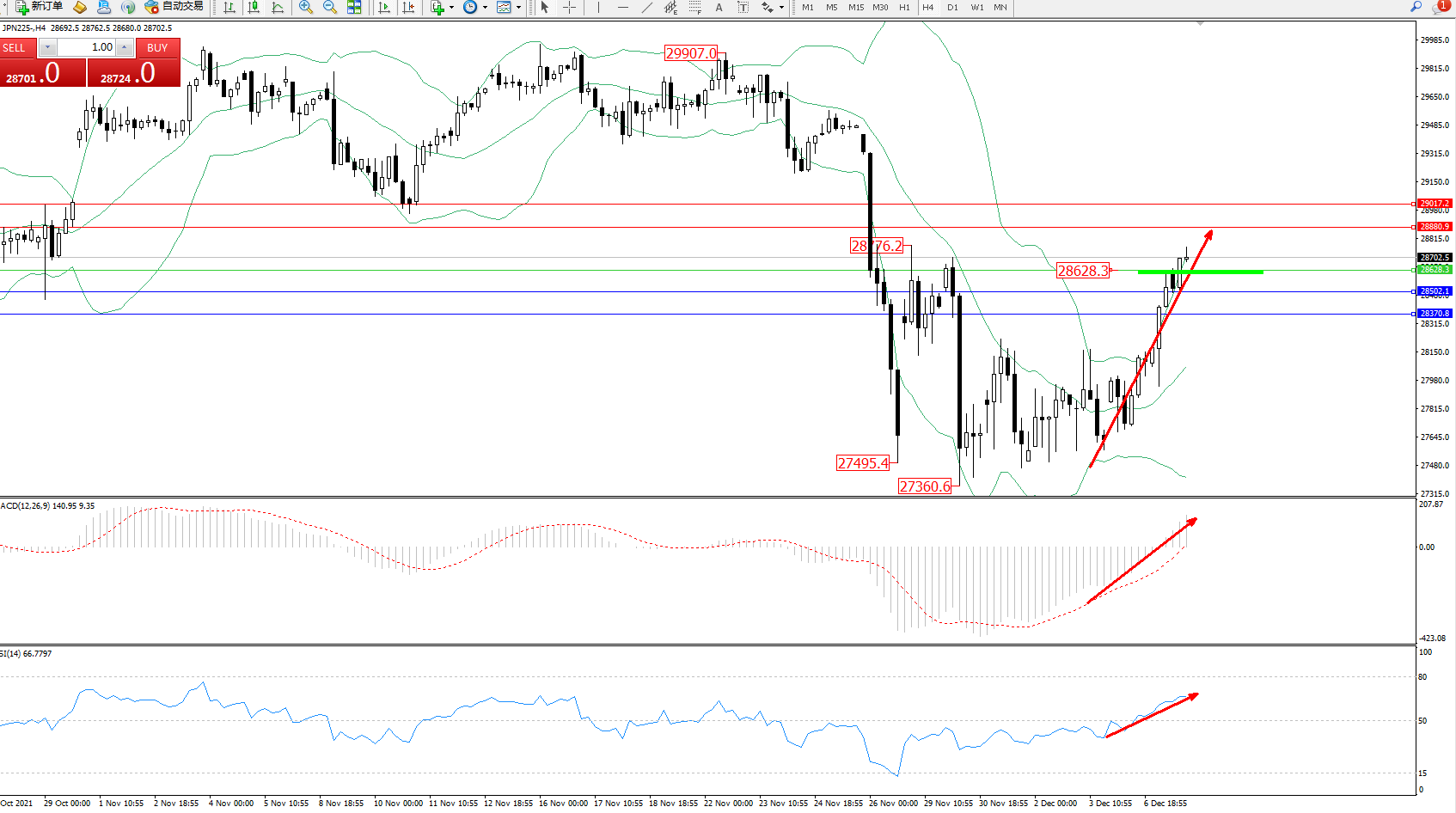 日经指数JPN225——4小时K线图显示:
