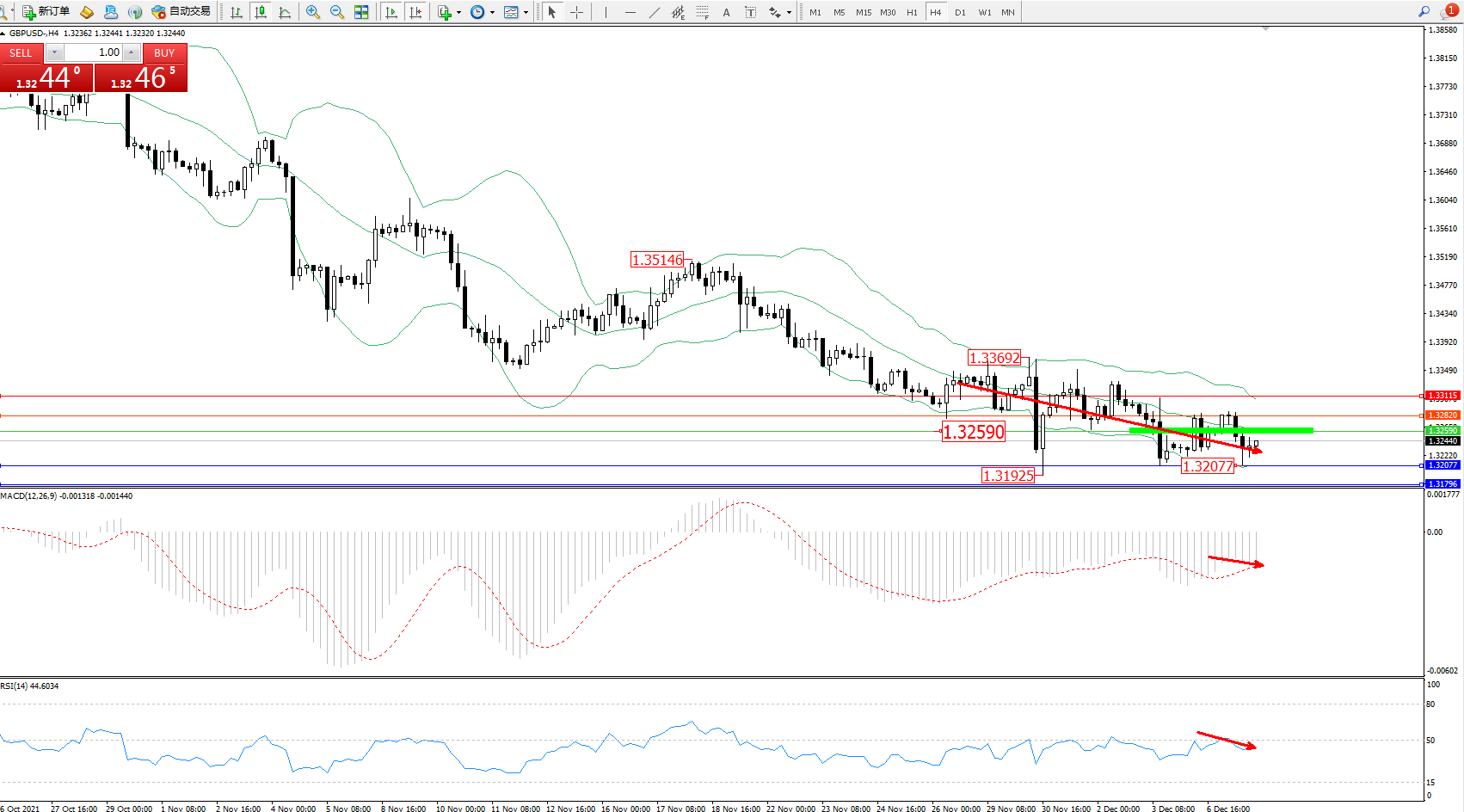 技术点评:空头动力延续布林带指标通道中下轨区间持续震荡下行,低位抵达1.32077位置后短期整理,但空头下行趋势态势良好,短期低位弱势徘徊后有继续向下移动态势,布林带指标呈空头趋势持续下行,MACD指标处于空头区域维持整理中,RSI指标处于50均衡线下方弱势徘徊中;