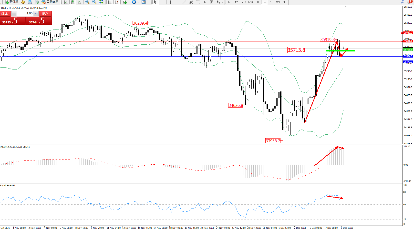 道琼斯指数DJ30——4小时K线图显示: