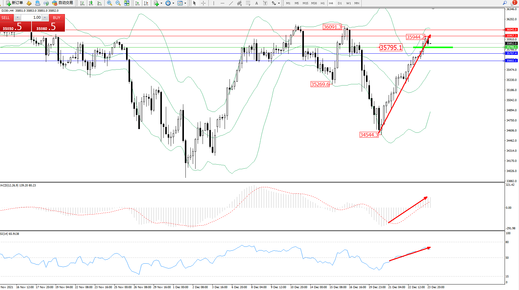 道琼斯指数DJ30——4小时K线图显示: