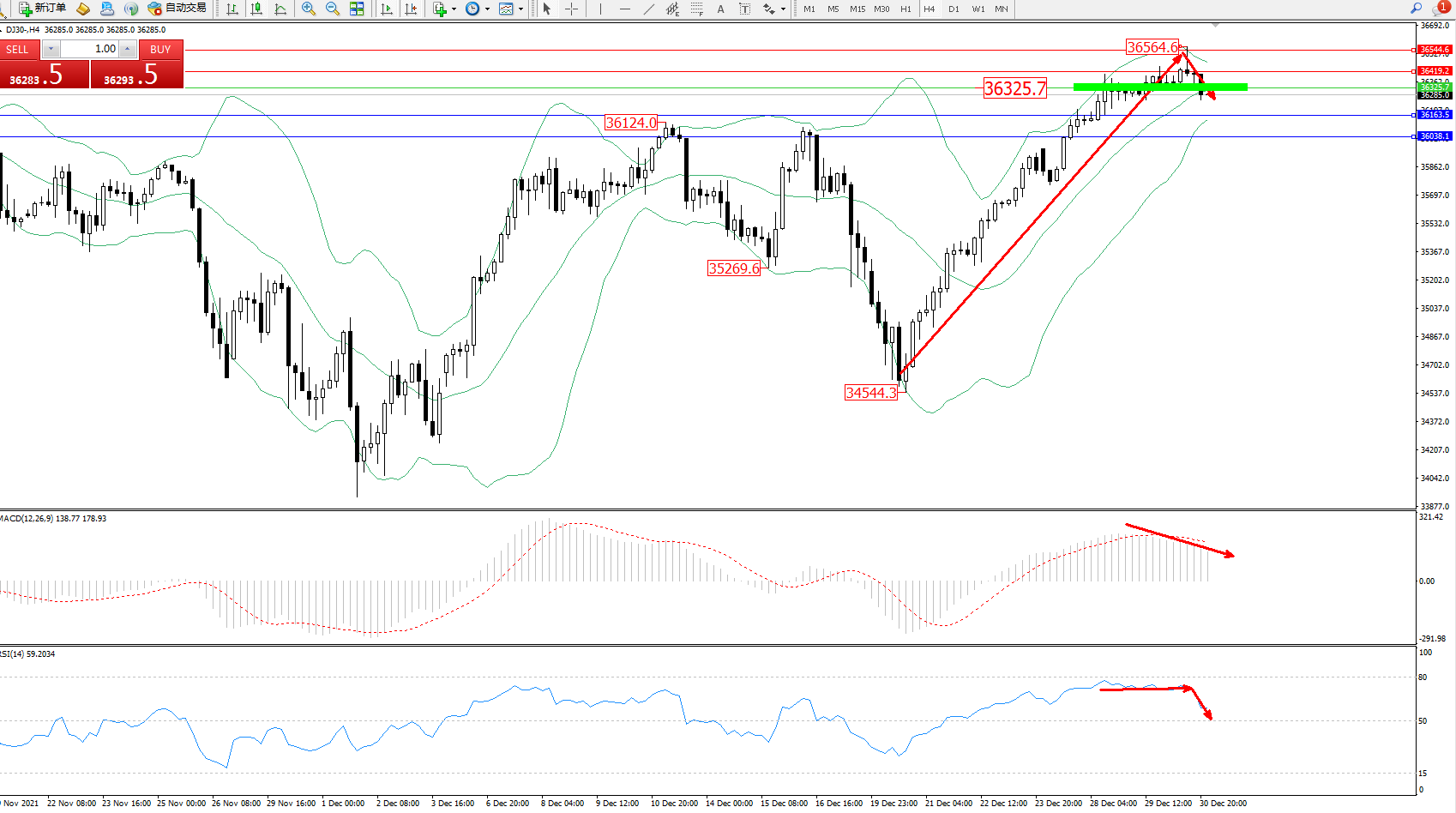 道琼斯指数DJ30——4小时K线图显示: