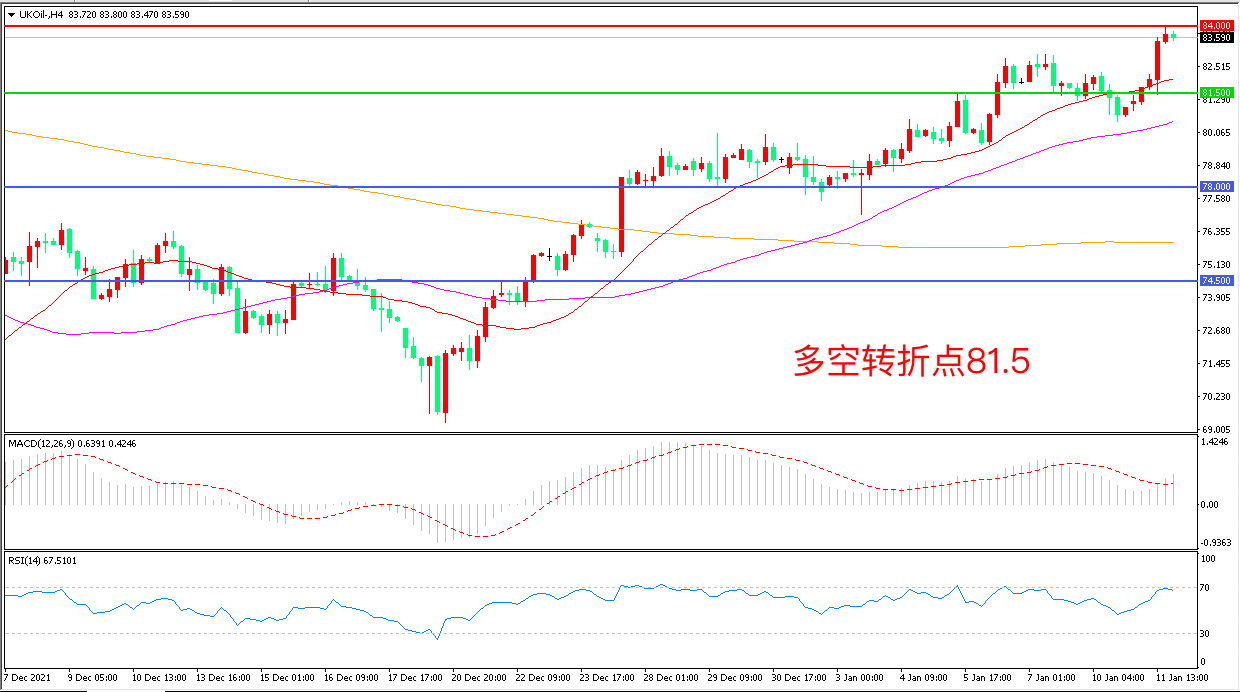 4小时图看,油价长阳拉升,突破前期整理区间,整体表现偏强,81.5成为多空分水岭,MACD红柱增加,RSI指标走平,日内震荡上行概率较大。