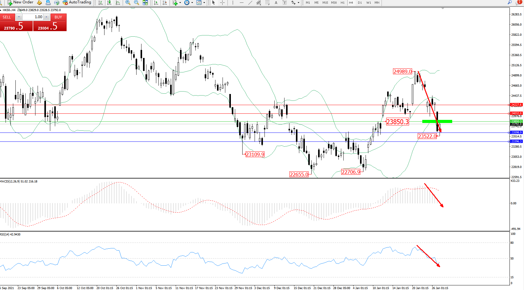 恒指HK50 ——4小时K线图显示: