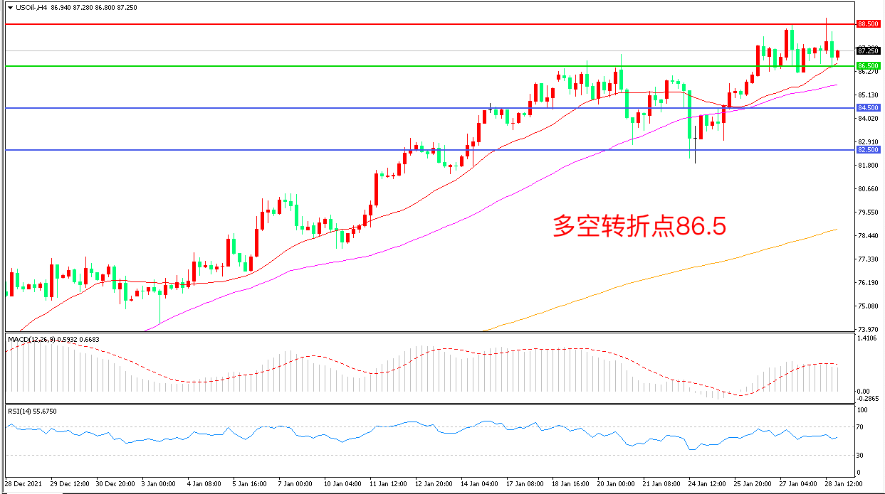 4小时图看,油价延续高位调整走势,区间震荡继续明显,均线系统成为下方支撑,88.5成为上方阻力,MACD红柱增加,RSI指标走平,日内震荡上行概率较大。