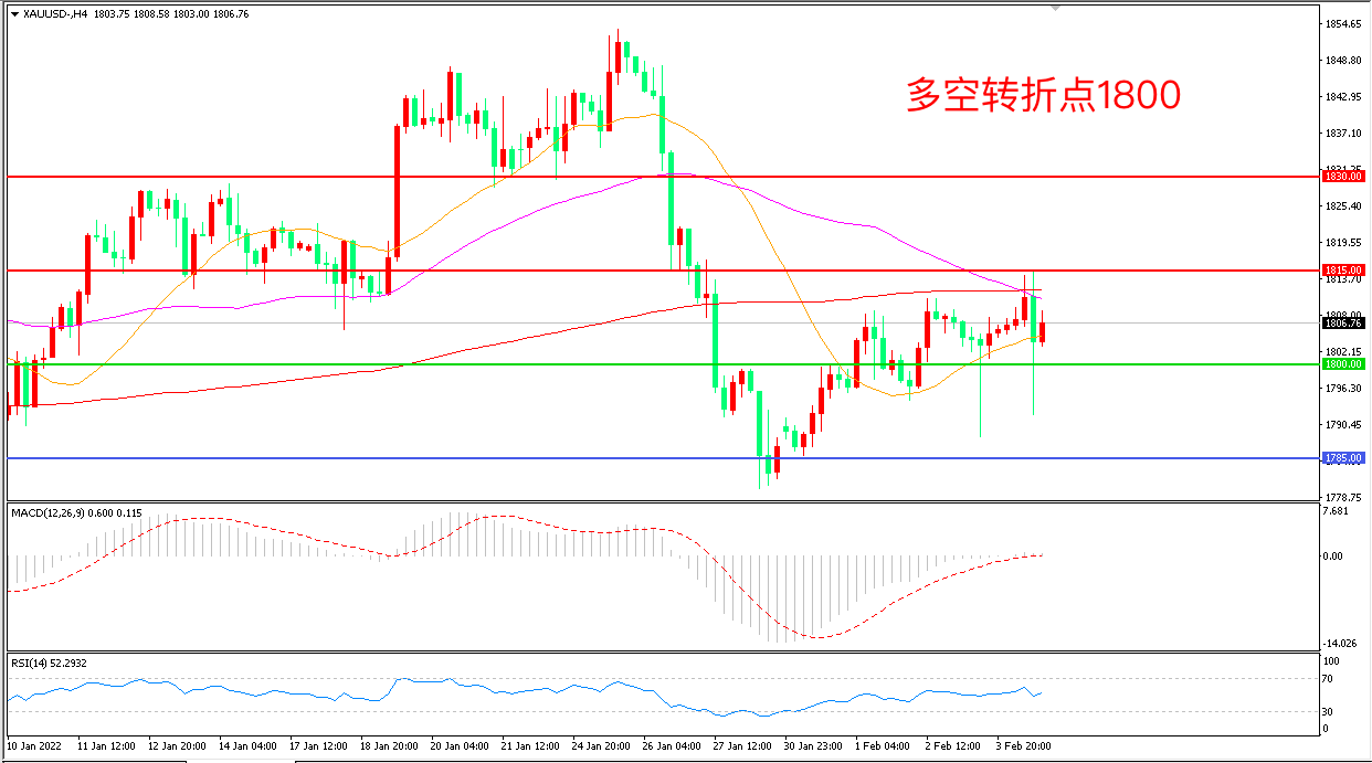 上周五(2月4日),美国1月非农就业人数意外增加46.7万,远超预期的数据表现强化了美联储将在3月加息的市场预期,多空双方激烈厮杀,金价巨幅震荡后收报1806.76美元/盎司。现在的问题是,如此强劲的报告是否会让人们再次谈论3月份加息缩债以及市场定价消化紧缩政策的程度,短期金价延续震荡概率较大。