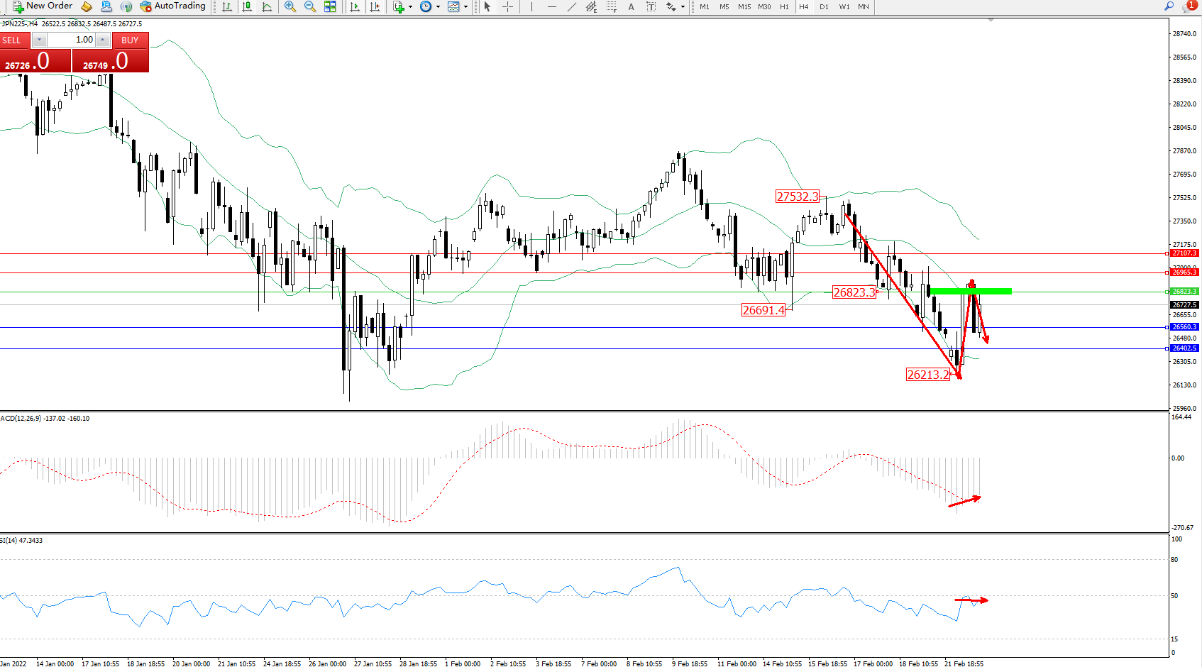 日经指数JPN225——4小时K线图显示: