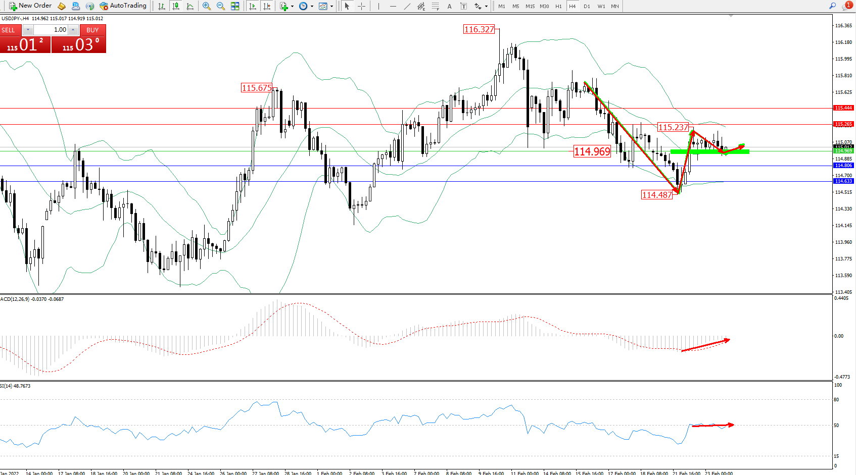 技术点评:空头动力延续布林带指标通道中下轨区间持续震荡下挫,低位抵达114.487位置得到支撑反转上扬,短期多头伺机入场,但整体市场下行趋势态势良好,空头动力再度整理向下移动,跌破布林带指标中轨维持节点后有继续下挫态势,布林带指标呈收口走势缓慢平移后开始下行,MACD指标处于0轴线下方弱势徘徊,RSI指标处于50均衡线下侧整理下移中;