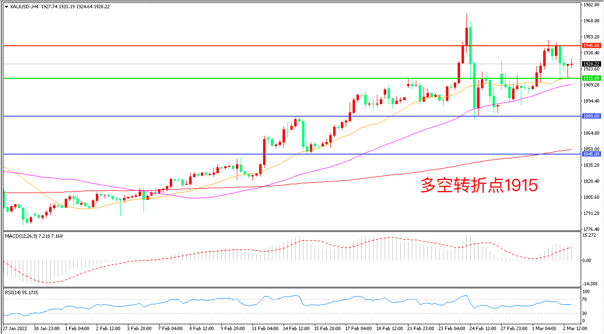 周三(3月2日),鲍威尔声称支持3月加息25个基点,有“小非农”之称的ADP就业数据增加47.5万人,远超过市场预期,地缘政治与加息压力等多种因素交织,现货黄金延续高位震荡,收报1928.22美元/盎司。周五市场将迎来万众瞩目的非农就业数据,务必重点关注。