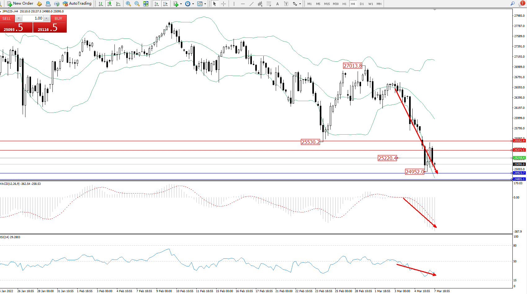 技术点评:空头动力延续布林带指标下轨不断下挫,低位抵达24952位置节点后开始震荡,短期空头动力有继续下行态势,布林带指标呈张口走势持续中,市场整体弱势走势持续, MACD指标处于空头区域维持震荡下行,RSI指标处于空头区域维持震荡下行后低位整理;