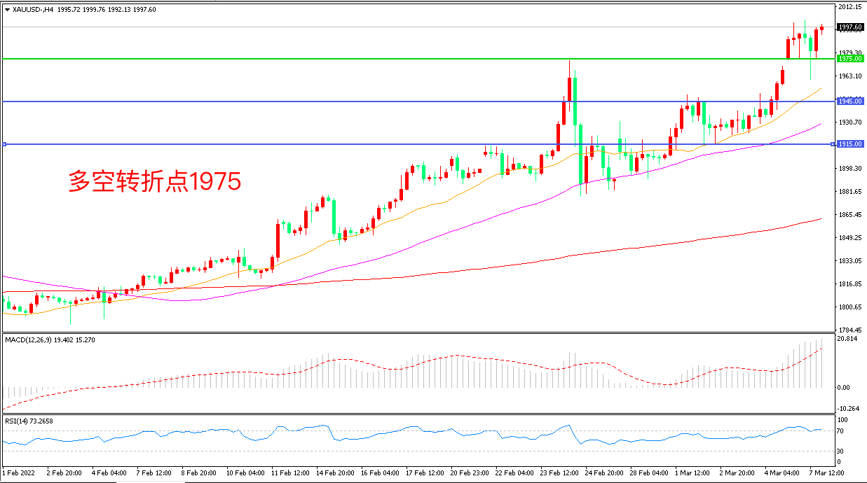 周一(3月7日),第三轮俄乌谈判无实质结果,美国考虑禁止进口俄罗斯产油令市场预期通胀进一步走高,现货黄金高开后延续强势表现,收报1997.60美元/盎司。本周,投资者正准备迎接又一份爆表的美国通胀报告,而持续剑拔弩张的俄乌局势则日益给美股和全球经济蒙上阴影,通胀和避险情绪将持续为金价上行提供支撑。