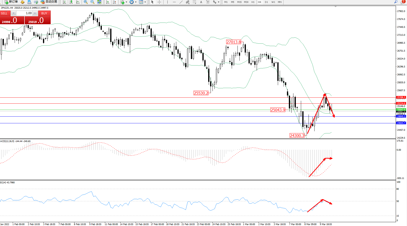 日经指数JPN225——4小时K线图显示: