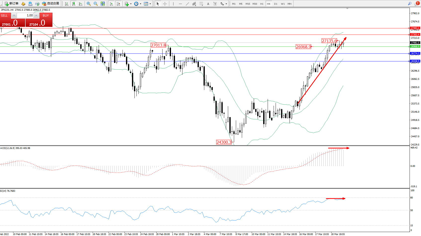 日经指数JPN225——4小时K线图显示: