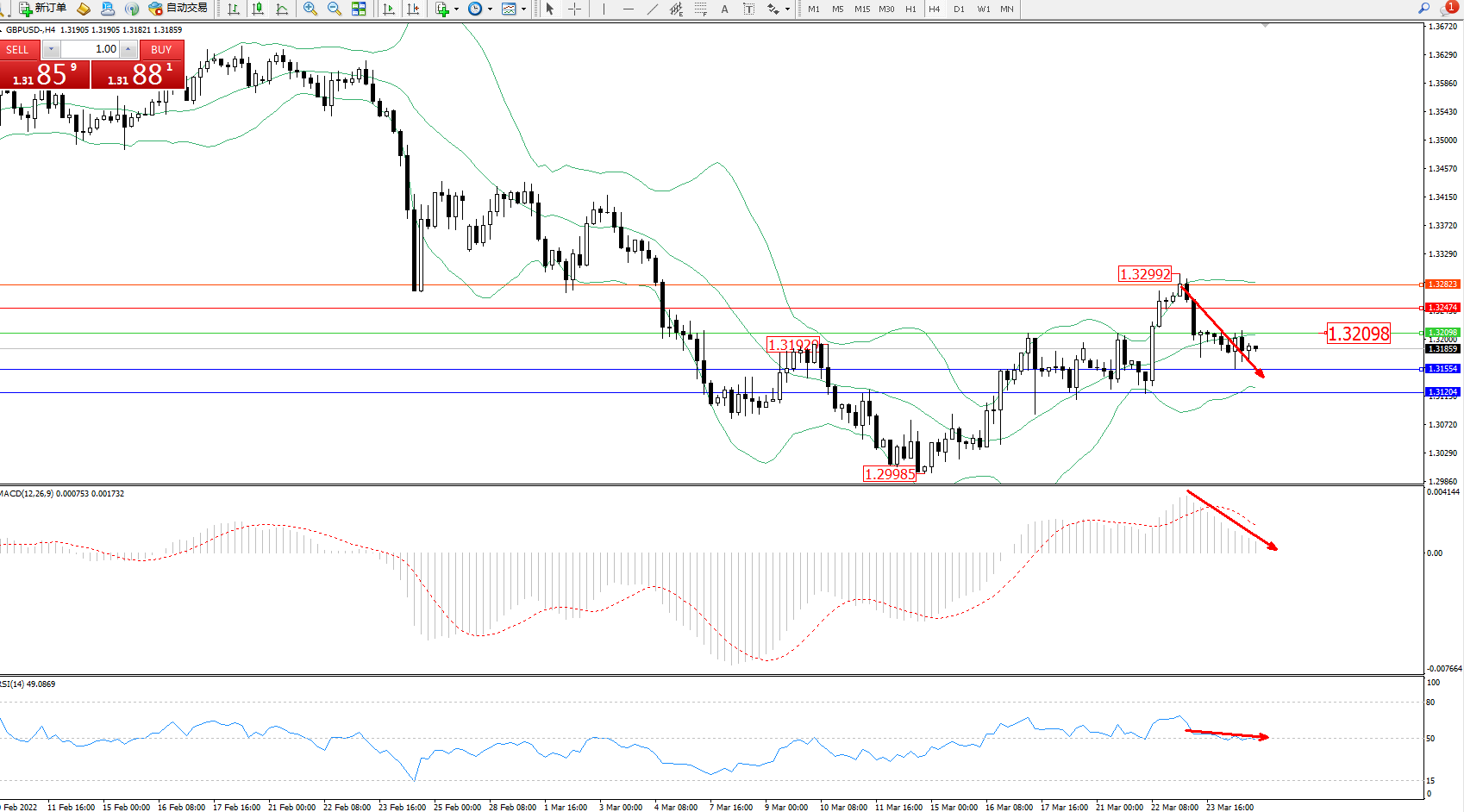 交易策略:1.32098下方看跌,目标1.31554、1.31204
