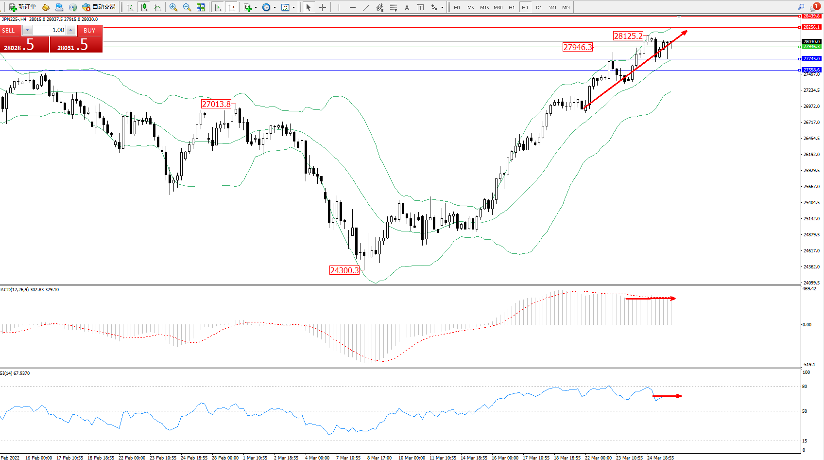 日经指数JPN225——4小时K线图显示: