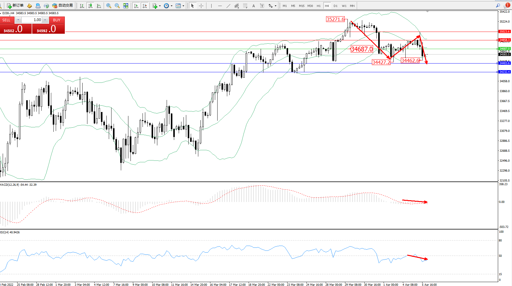 交易策略:34687下方看跌,目标34403、34232