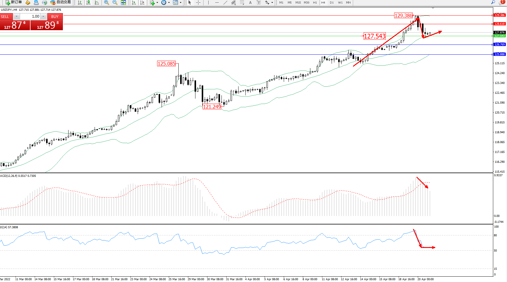 交易策略:127.543上方看涨,目标128.618、129.386