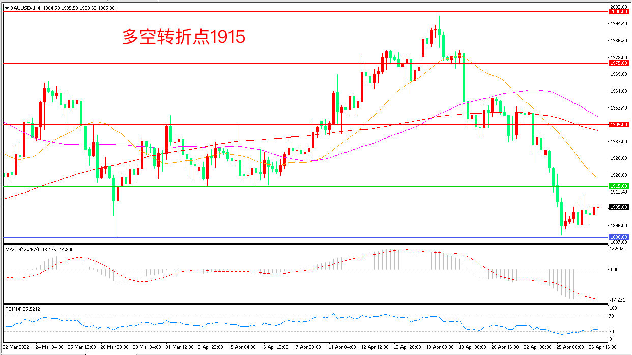 周二(4月26日),美国经济数据表现不佳,引发市场对增长衰退的担忧,美元突破102大关,现货黄金延续低位震荡,收报1904.52美元/盎司。尽管黄金被认为是对冲通胀和如乌克兰战争等不确定性的工具,但对美联储快速加息的预期令其涨幅受限,短期金价方向将取决于美联储5月会议来临前的美国GDP和PCE数据。
