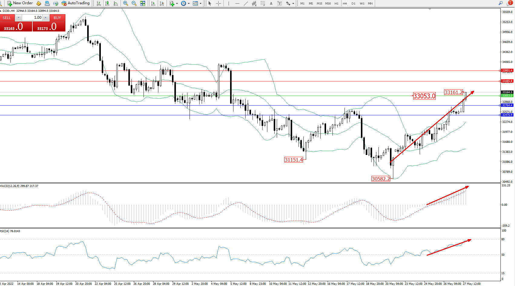 道琼斯指数DJ30——4小时K线图显示:
