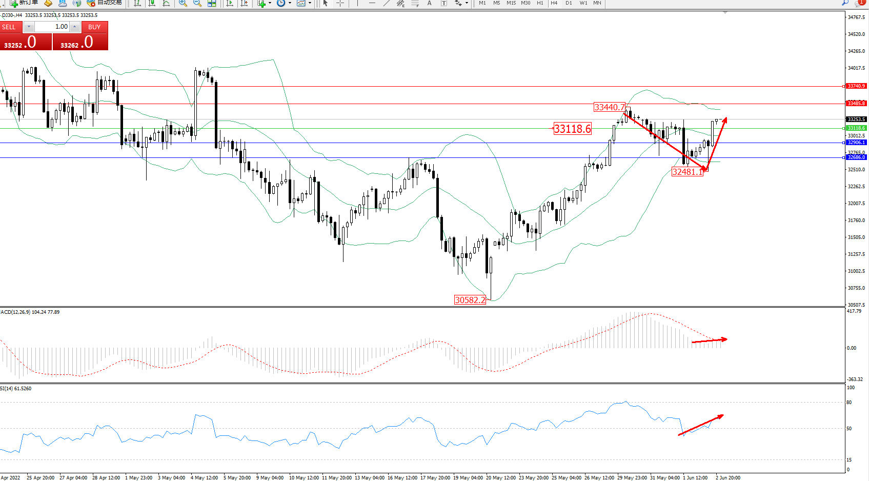 道琼斯指数DJ30——4小时K线图显示: