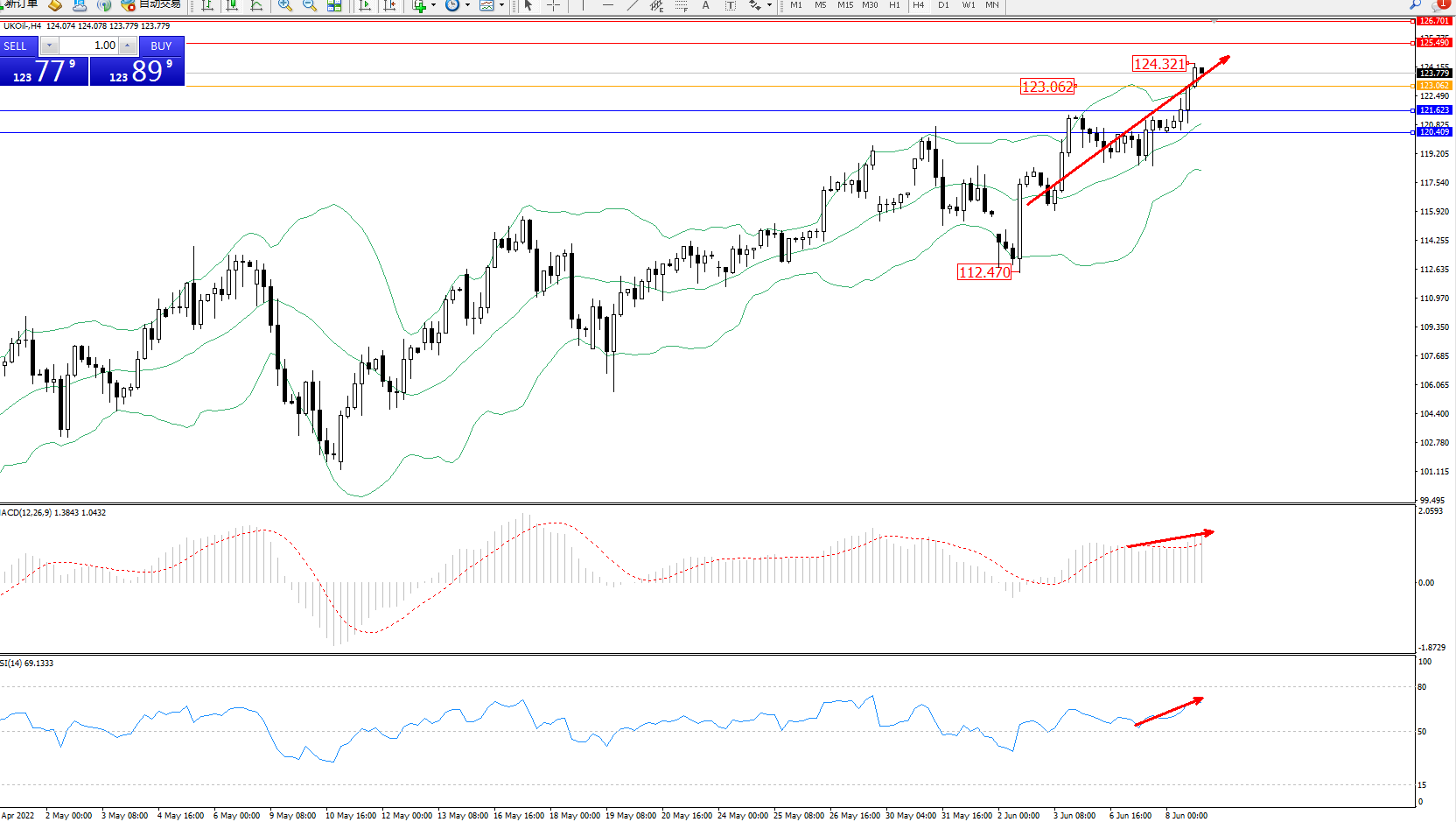 技术点评:多头动力延续布林带指标通道中上轨区间持续震荡上扬,高位抵达124.321附近节点后整理,布林带指标呈上行趋势不断上移,MACD指标处于多头区域维持整理缓慢上移,RSI指标处于多头区域不断拉升中;