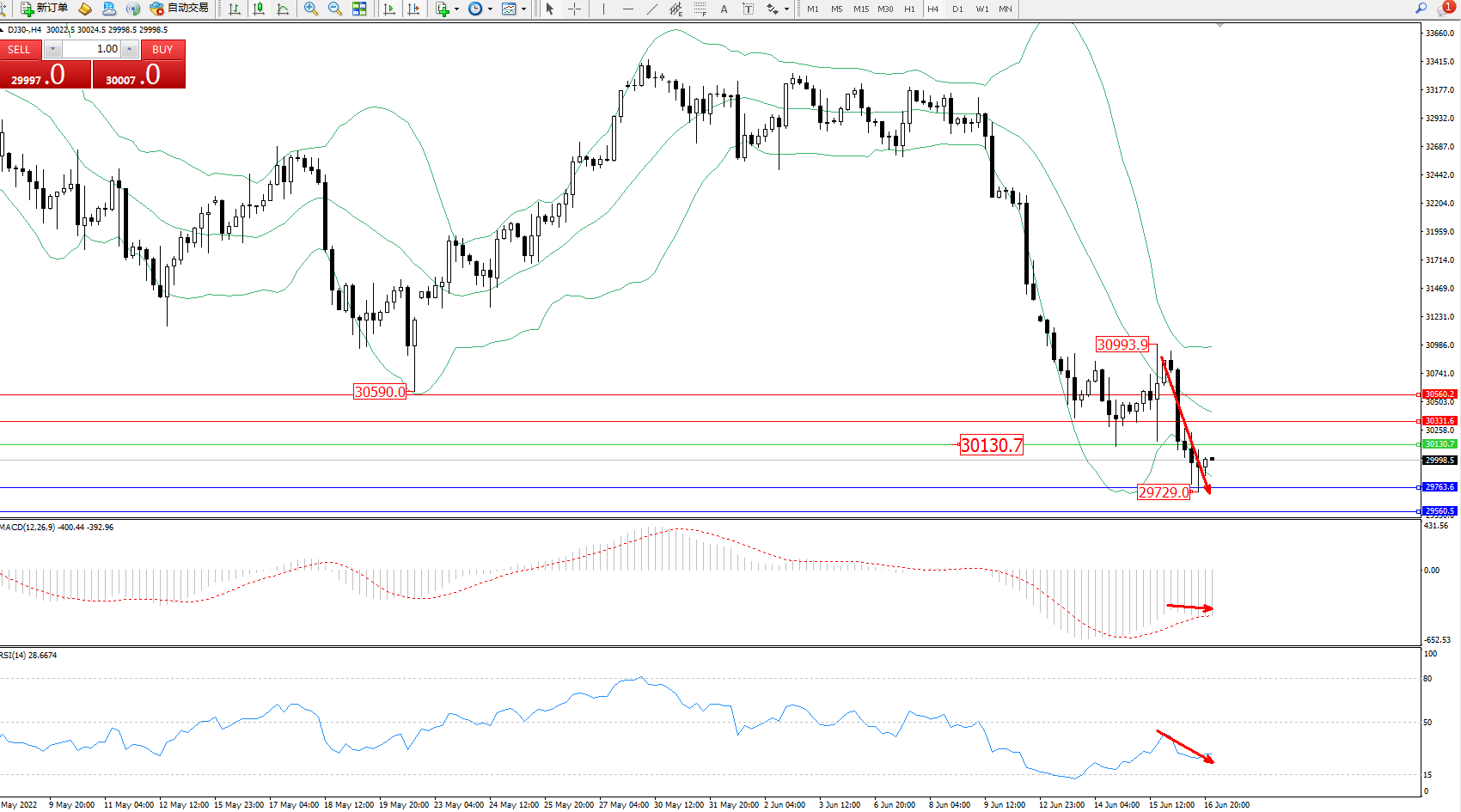 道琼斯指数DJ30——4小时K线图显示:
