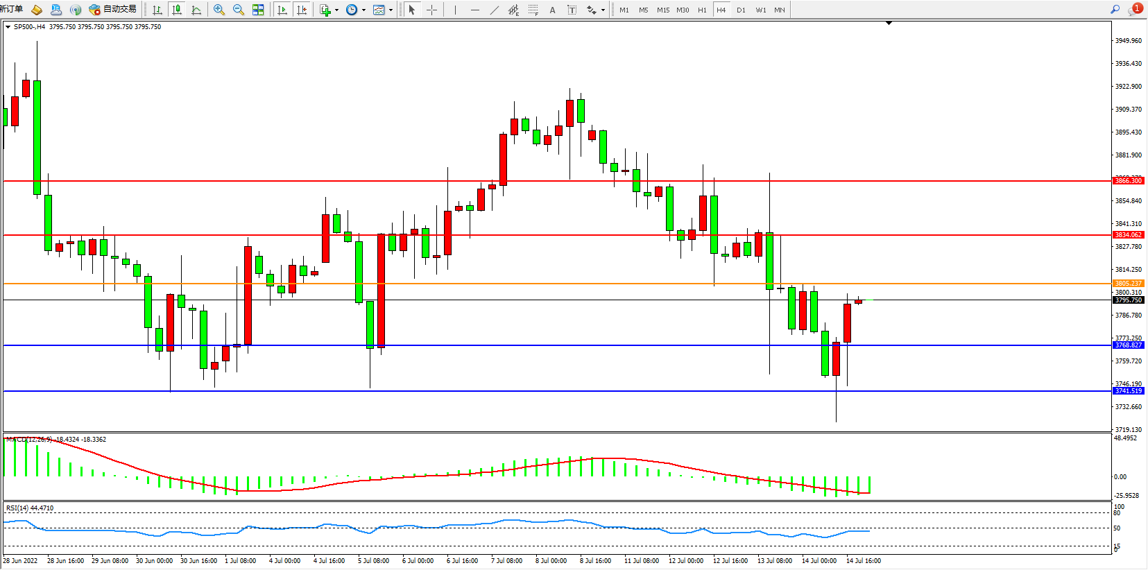 标普SP500——4小时K线图显示: