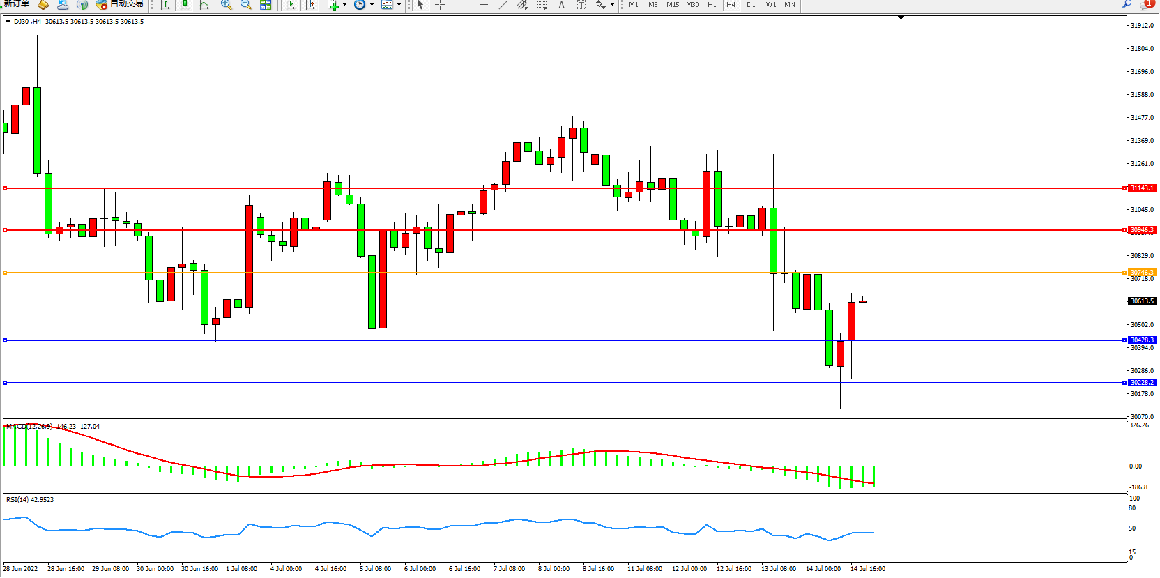 道琼斯指数DJ30——4小时K线图显示: