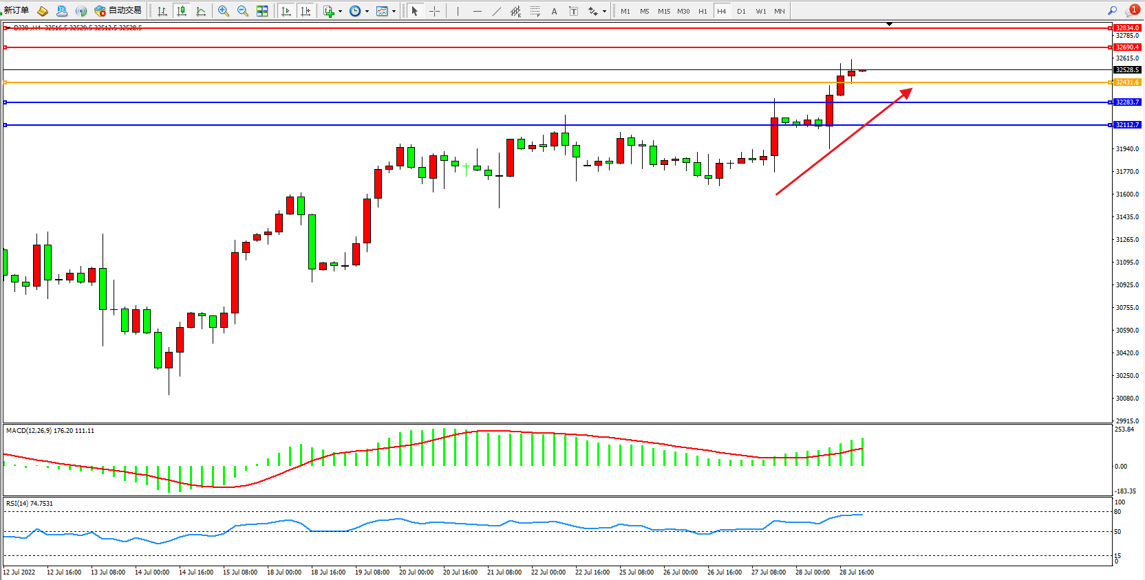 道琼斯指数DJ30——4小时K线图显示: