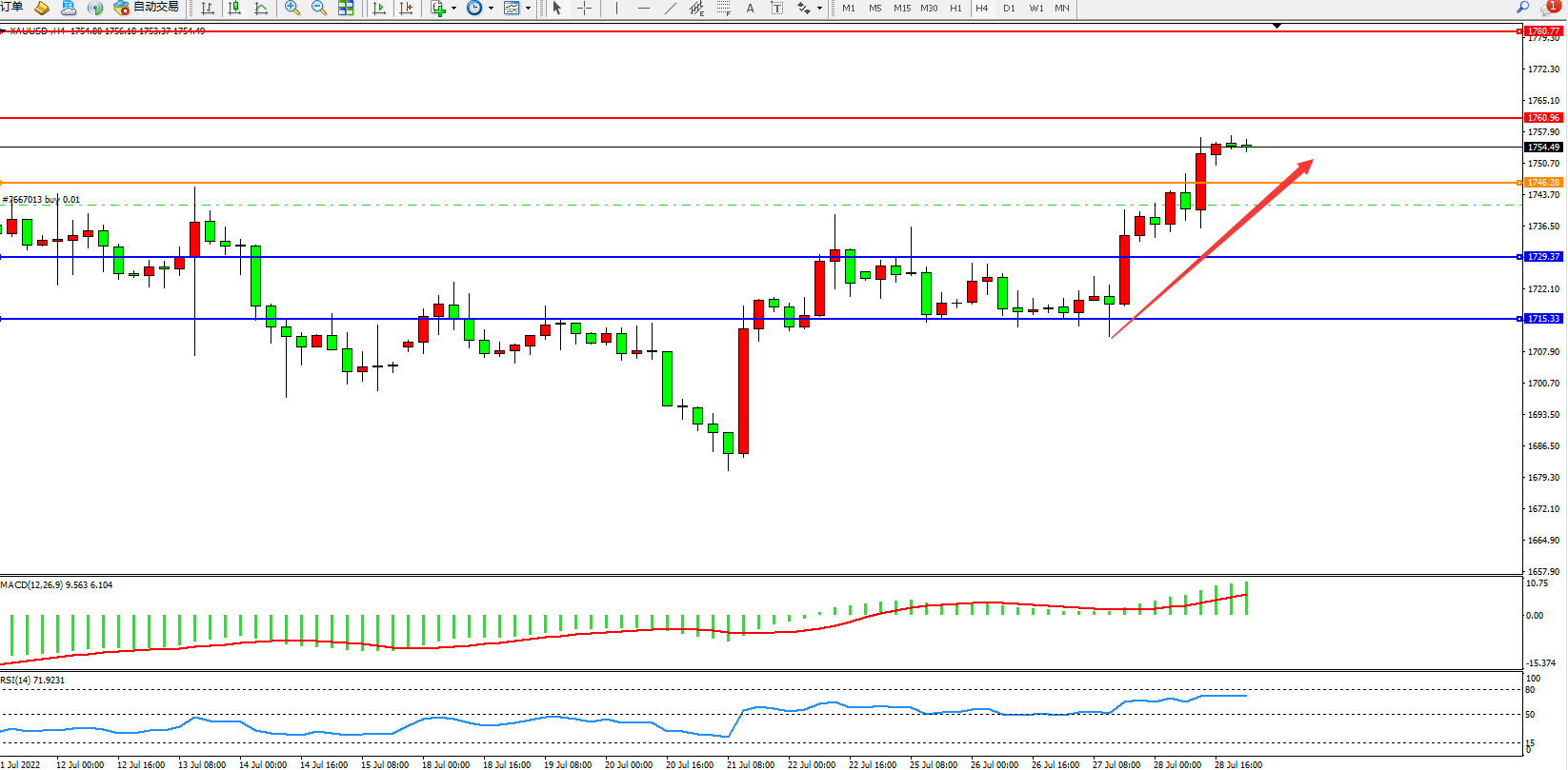 周四(7月28日)美国GDP数据录得-0.9%,为连续第二个季度负值,符合技术性衰退的标准定义。美指数阴跌不断,10年期美债收益率跌破2.7%,现货黄金上涨一度突破1750关口,最终收涨1.29%。在GDP数据引发衰退之际,美联储加息押注遭大幅下调,黄金有望持续获得反弹空间。