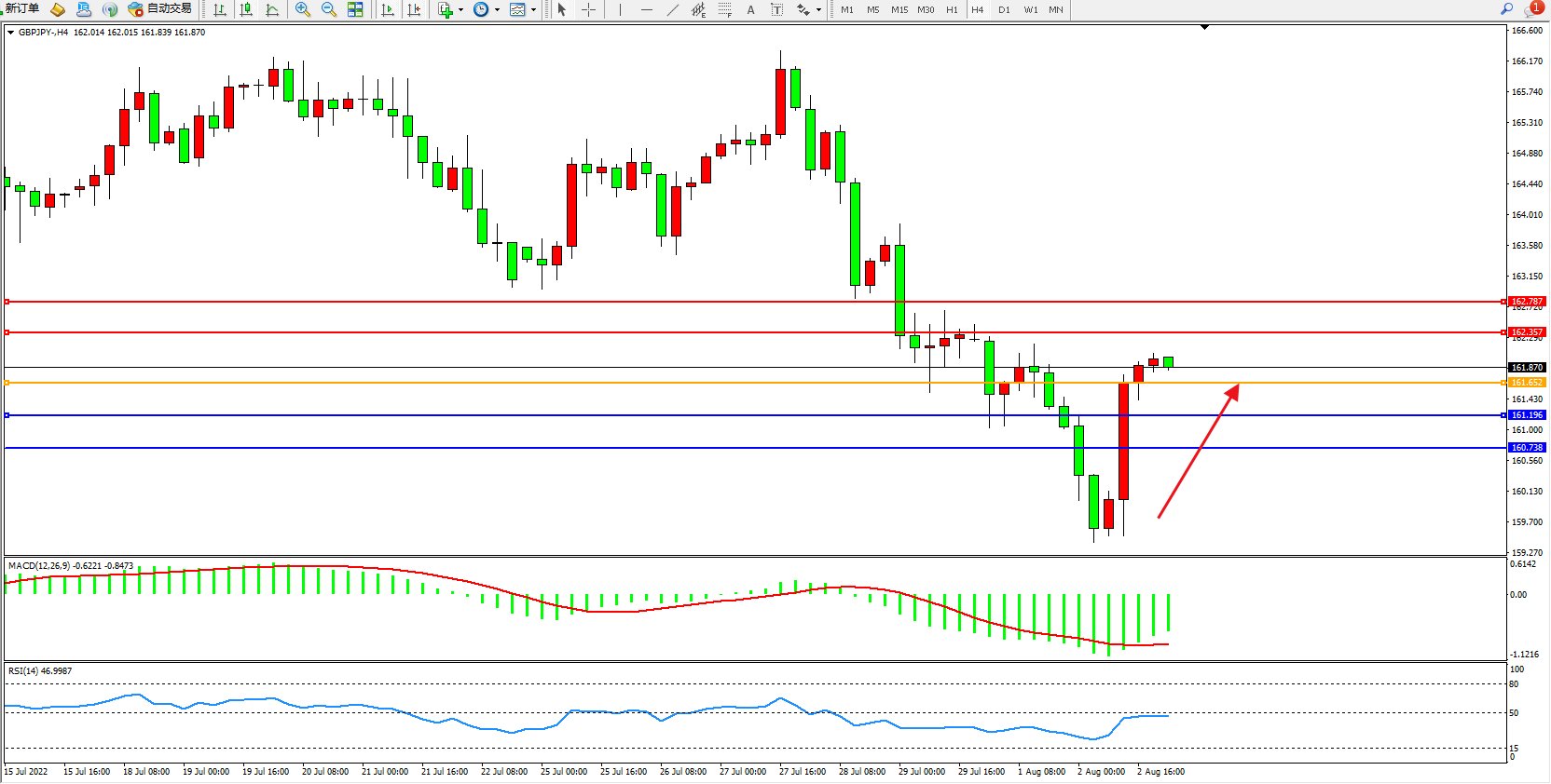 备选策略:161.652下方看跌,目标161.196、160.738