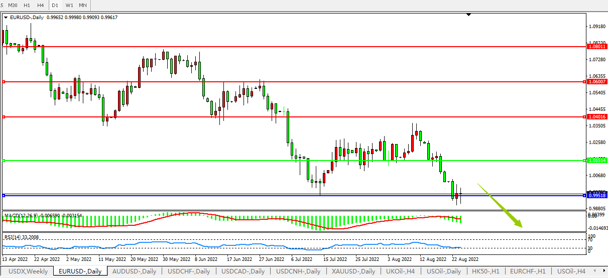 日线图看:短线汇价快速下跌后稍微止步,MACD运行于0轴下且量能0轴下加速放量,RSI快速下行,预计短期汇价大概率将载反弹后进一步下行。