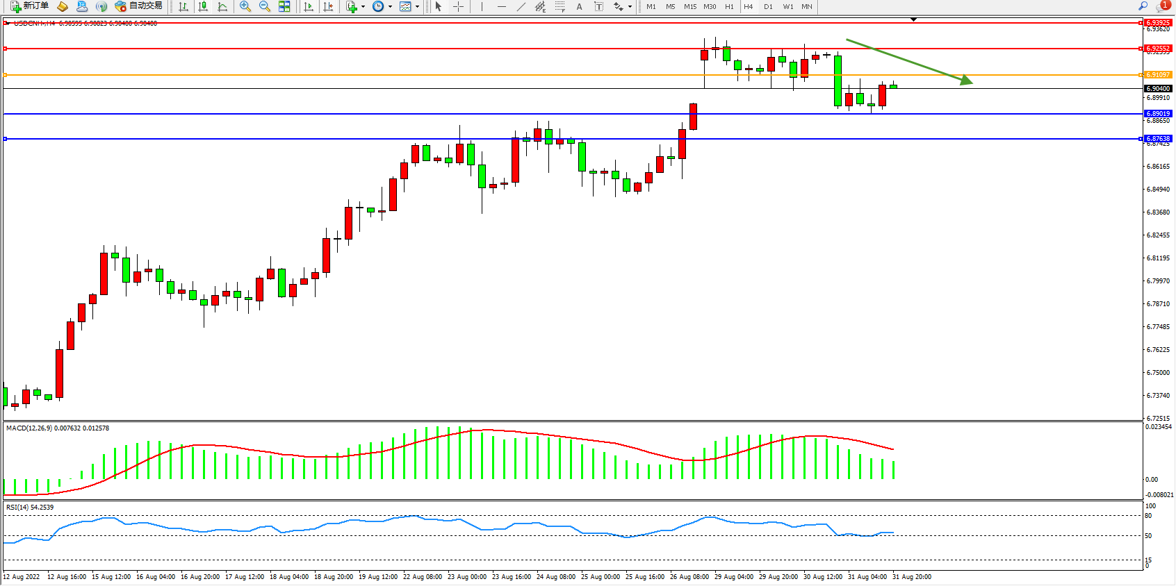 交易策略:6.91097下方看跌,目标6.89019、6.87638