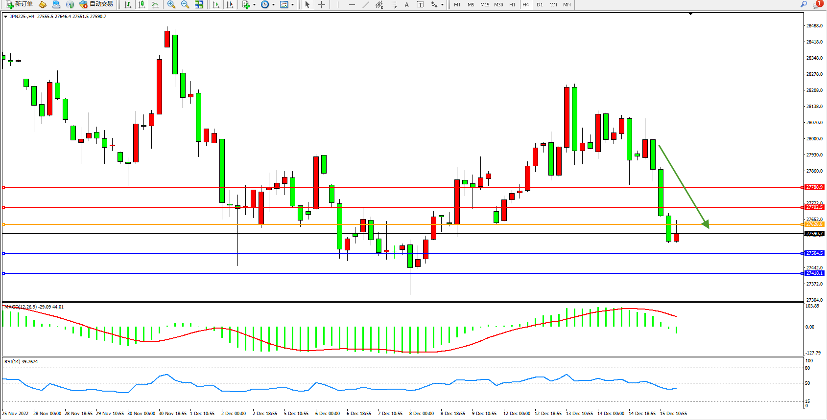 日经指数JPN225——4小时K线图显示: